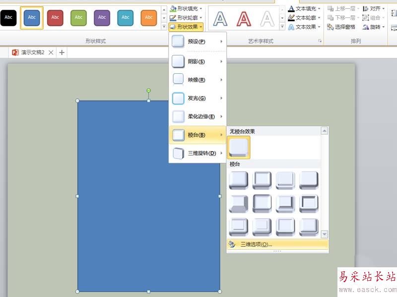3、執(zhí)行插入-形狀命令,插入一個矩形,執(zhí)行形狀效果-棱臺-三維棱臺命令。