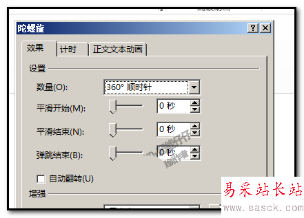 4、點擊陀螺旋的動畫右側的小三角,彈出面板中點:從上一項開始。設置了這個,才能使到動作路徑的直線動作與陀螺旋的動作一起進行。再雙擊陀螺旋動畫,彈出操作面板
