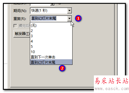 5、點擊:計時,打開“計時”選項內容;在“重復”這里,點小三角,彈出菜單中點:直至幻燈片末尾,設置這個才會讓旋轉一直轉,不會在中途停下來。大家可以試驗下。