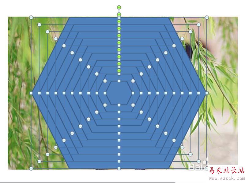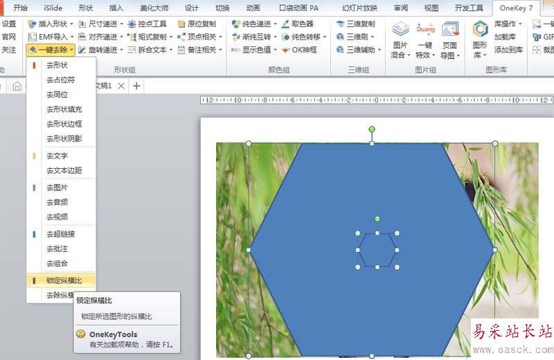 4、選擇第一個六邊形將去縮小,選擇所有的圖形,執(zhí)行onekey7-一鍵去除-鎖定縱橫比命令。