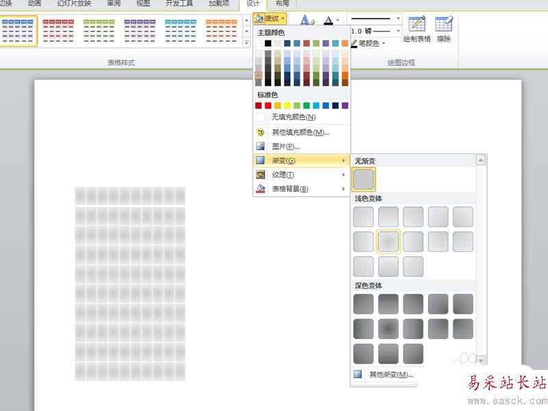 3、執(zhí)行設(shè)計(jì)菜單,設(shè)置底紋為為漸變,選擇自己喜歡的一種漸變。