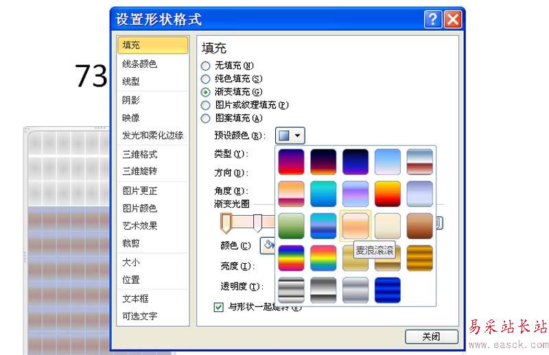 5、選擇73個(gè)長(zhǎng)方形,設(shè)置底紋為其他漸變,并設(shè)置漸變的顏色。