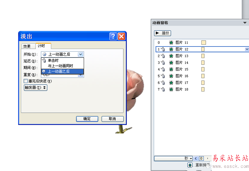 6、依次選擇剩下的圖片動畫,設置開始為上一動畫之后,按f5播放查看動畫效果。