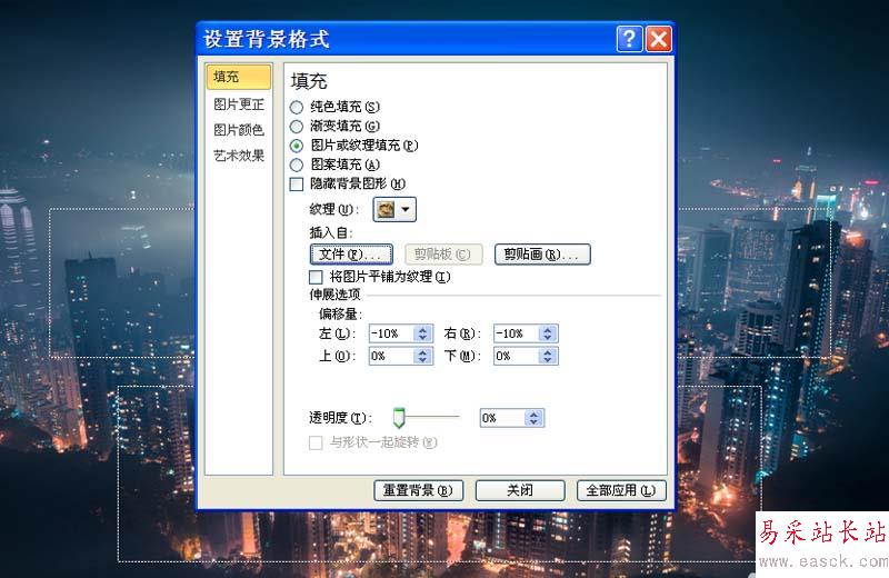 2、在彈出的設(shè)置背景格式對話框中設(shè)置圖片或紋理填充,選擇一張圖片進行填充。
