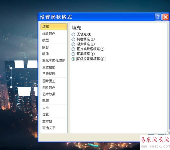 5、接著在矩形里輸入文字,右鍵單擊矩形從下拉菜單中選擇設(shè)置圖形格式,從中選擇用幻燈片背景填充選項。