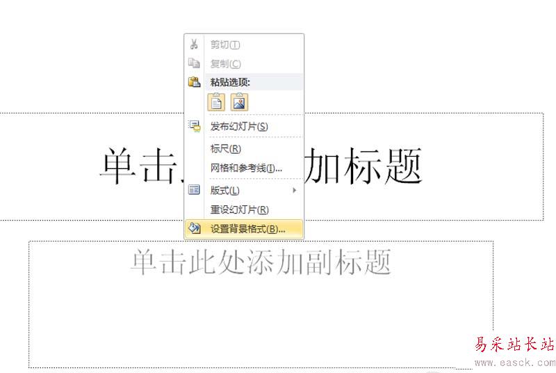 1、首先啟動ppt2010,右鍵單擊從下拉菜單中選擇設(shè)置背景格式命令。