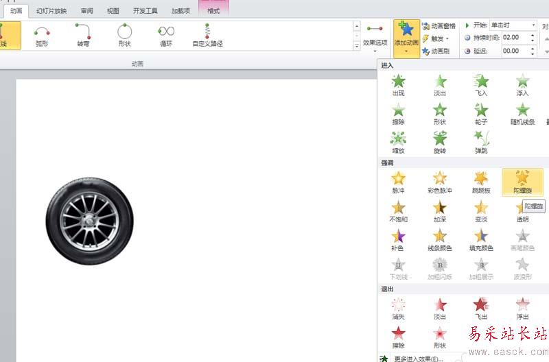 3、按住shift鍵調整路徑的長度,再次執行動畫-添加動畫命令,從強調中選擇陀螺旋動畫。