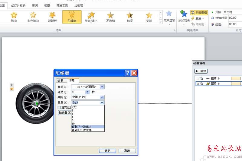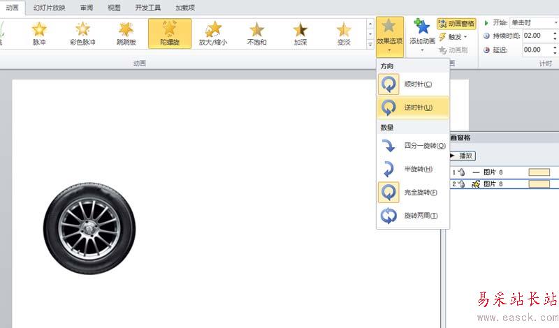 4、調出動畫窗格,選擇第二個動畫,設置效果選項為逆時針。
