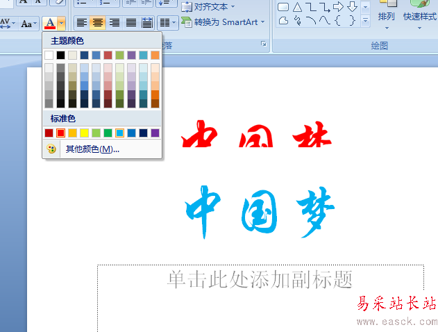 2、然后,把“中國夢”這三個字設置好第一種顏色,我們的第一顏色使用紅色,字體用行楷,如下圖: