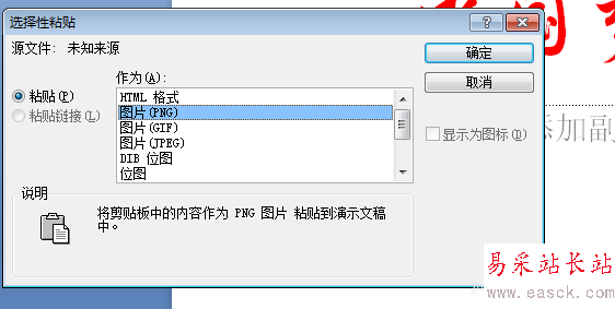 4、在彈出的窗口中,選擇作為“圖片(PNG)”,實際其他的類型也是可以的,然后確定,就把文字轉化為圖片的形式了。