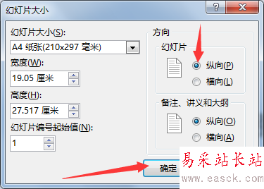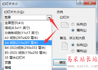 2、在彈出來的對話框中-“幻燈片大小”下拉選擇A4紙張。注意方向選擇“縱向”。然后選擇確保合適。