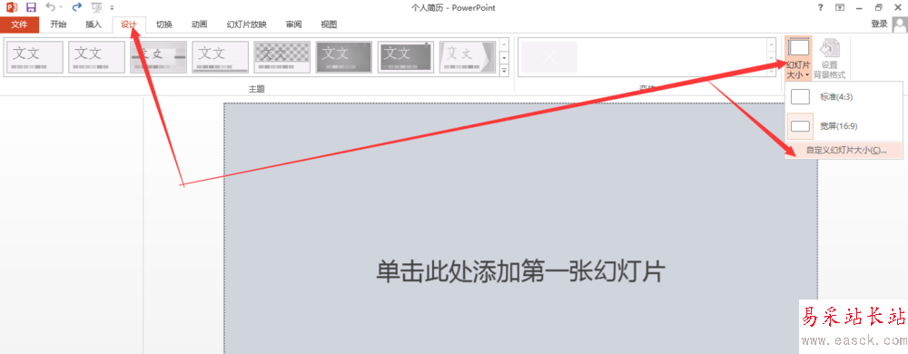 1、首先新建一個PPT并打開它,在“設計”--“幻燈片大小”——“自定義幻燈片大小”。