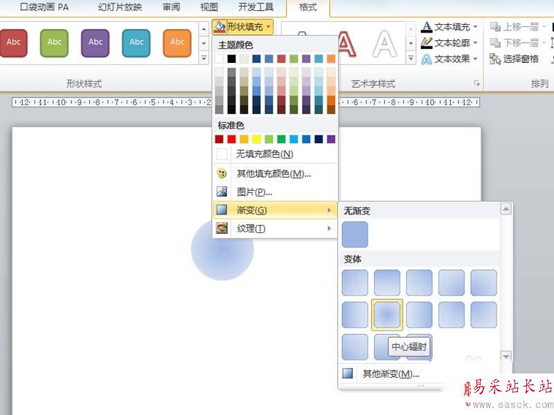 2、設置形狀填充為漸變填充,選擇中心輻射,形狀輪廓為無,接著設置形狀效果為映像。