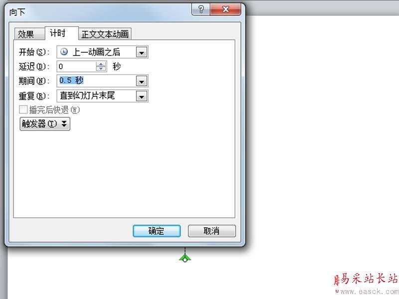 5、切換到計時選項卡,設置開始為上一動畫之后,期間為0.5s。