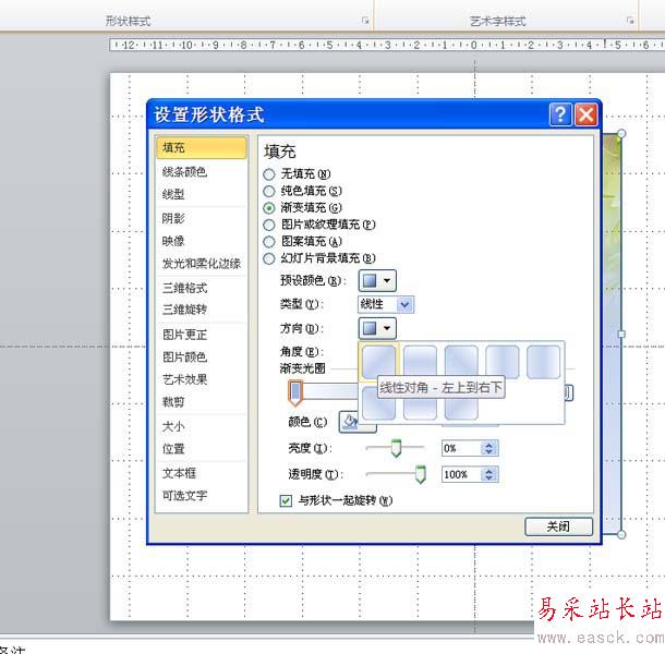4、在彈出的對話框中設置填充為漸變填充,方向設置左上到右下。