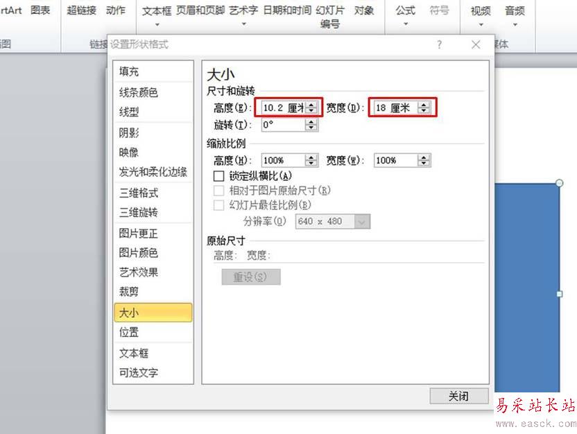 2、在彈出來的設置頁面中,對高度和寬度面的對話框中直接輸入參數值或是點擊向上或是向下的箭頭圖形,實現參數值的調整,最后點擊對話框右下方的關閉按鈕,實現圖形大小的調整。