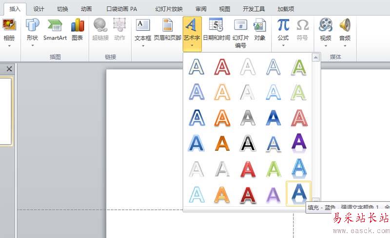 1、首先啟動(dòng)ppt2010,執(zhí)行插入-藝術(shù)字命令,從下拉菜單中選擇一種藝術(shù)字形式。