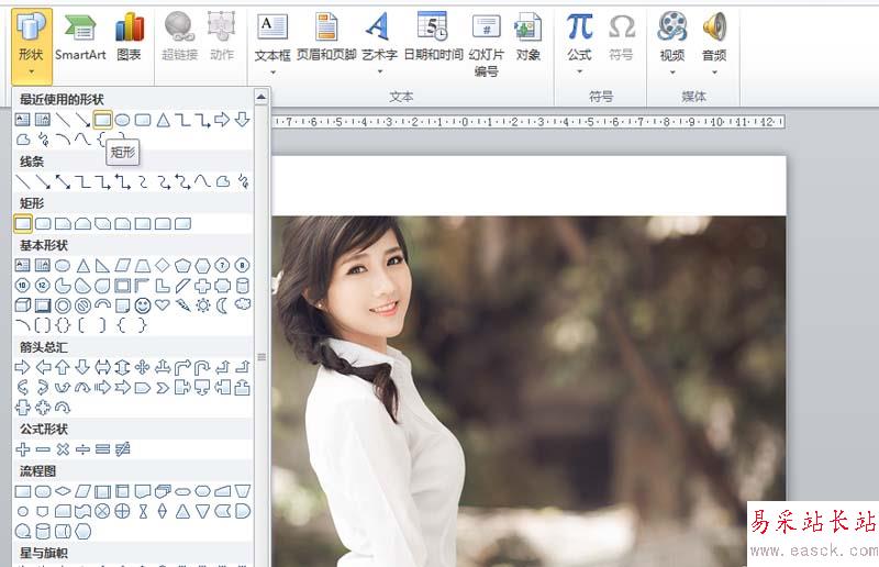2、執(zhí)行插入-形狀命令,從下拉菜單中選擇長(zhǎng)方形,并繪制一個(gè)長(zhǎng)方形。