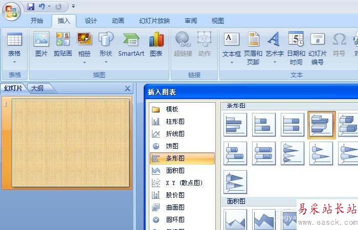 1、打開PPT軟件,新建一個(gè)空白的文件,鼠標(biāo)左鍵單擊菜單下的【插入】>>【圖表】>>【條形圖】,如下圖所示。