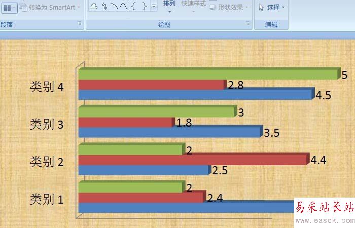 2、在【條形圖】中,可看到有不同風(fēng)格樣式的圖形,選擇一個(gè),數(shù)據(jù)用默認(rèn)的,可直接看到【條形圖】的圖表,如下圖所示。