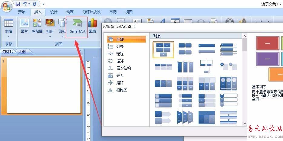 3、接著,點擊上方的SmartArt, 根據你的需要,選擇各種圖形,如圖所示