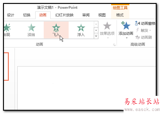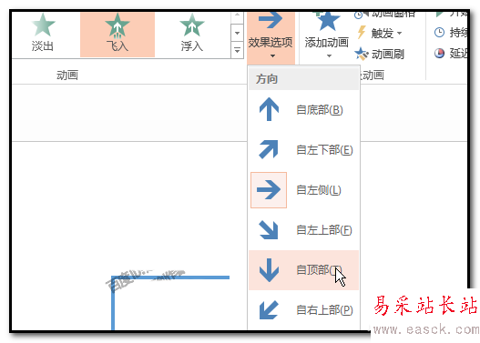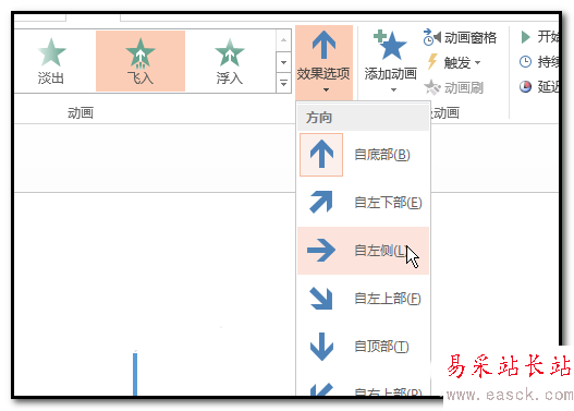 5、然后,再點:動畫選項卡,再點:飛入,點飛入后,右邊的效果選項被激活了,我們點擊它,在彈出的列表中選擇飛入效果,自左側