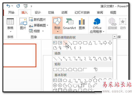 2、然后,我們點擊:插入-形狀,在彈出的形狀面板中,點:直線
