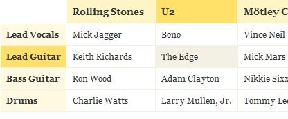 ask the css guy table 演示了怎么樣創建一個可以顯示數據之間的關系的表格,例如在單擊某個單元格時可以同時突出顯示最頂端的行和最左邊的列。