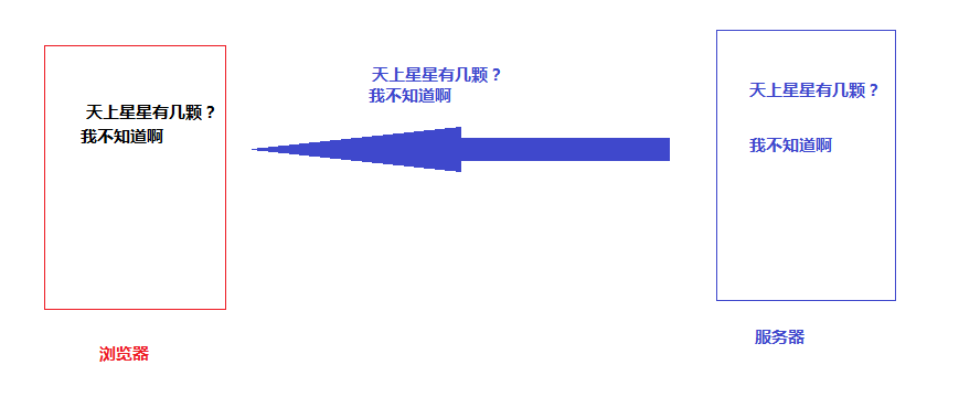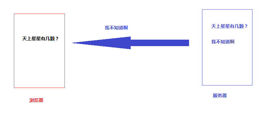 上面介紹了瀏覽器和服務器交互的簡單示意圖,可以看到在最后一步,瀏覽器接收到信息后將本頁面的內容全部進行了更新,但是一般情況下我們只需要將部分內容進行更新,那怎么辦呢?于是服務器干脆將這個頁面的內容修改后全部發送給瀏覽器,于是第2步,服務器向瀏覽器發送的便是"天上星星有幾顆?我不知道啊"這么多的內容,瀏覽器重新更新當前頁面后的結果和發送前的結果一比較,只多了"我不知道啊"這些內容