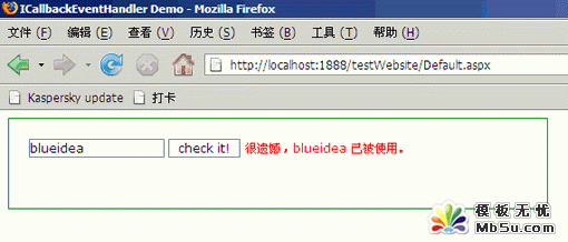 if (eventArgument.Equals("99love") || eventArgument.Equals("blueidea"))//假設這兩個名字不能注冊,實際操作中,你要是比對數據庫記錄的,我們現在簡化處理了。