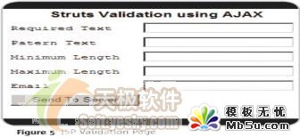 為了模仿校驗處理的結果,我們首先需要構建描述層-這可以通過加入我們已經構建的taglib來實現。在本文實例中,我將盡力使用Struts提供的校驗規則組件和表單本身的校驗功能來給出一個校驗的實例。現在,我們在JSP頁面中準備5個文本框。第一到第四個文本框使用校驗規則配置,第5個文本框使用來自action表單的校驗過程。此外,我們還需要一個提交按鈕來實現提交表單后對此的模仿。注意,至此,現有的Struts校驗仍然沒有使用AJAX。用戶接口如圖5所示。