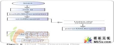 首先,客戶端初始化XMLHTTP組件以實現對服務器的請求。然后,一旦開始構建用戶激活的事件,URL的參數就被發送給服務器。在結束構建參數后,客戶端將依附oneadystatechange XMLHTTP事件來聽取(listen)來自服務器端的響應。在接收響應后,客戶端開始分析XML校驗消息并且把該消息存放到適當的地方(見圖6)。