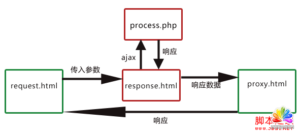要實現域a.com的request.html請求域b.com的process.php,可以將請求的參數通過URL傳給response.html,由response.html向process.php發出真正的ajax請求(response.html與process.php都屬于域b.com),然后將返回的結果通過URL傳給proxy.html,最后由于proxy.html與request.html是在同一域下,所以可以在proxy.html利用window.top將結果返回給request.html完成跨域通信。