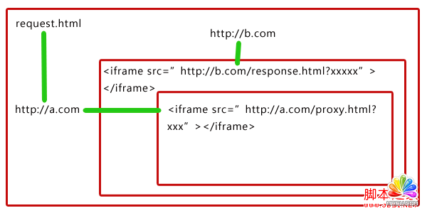 如下圖所示:域a.com的頁面request.html(即http://a.com/request.html)里面嵌套了一個iframe指向域b.com的response.html,而response.html里又嵌套了域a.com的proxy.html。