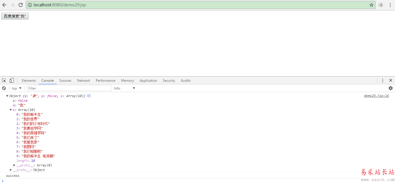 <html><head> <script type="text/javascript" src="/js/jquery.min.js"></script> <script type="text/javascript"> function getData(keyword) { var url="https://sp0.baidu.com/5a1Fazu8AA54nxGko9WTAnF6hhy/su?wd=" +keyword; $.ajax({ type: "get", async: false, url: encodeURI(url), dataType: "jsonp", jsonp: "cb", // 后臺定義的回調函數標識符(一般默認為:callback) jsonpCallback: "jsonCallback", // 自定義的jsonp回調函數名稱(默認為jQuery自動生成的隨機函數名) success: function(data,status){ console.log(data); console.log(status); }, error: function(){ alert('fail'); } }); } </script></head><body> <button onclick="getData('我');">百度搜索"我"</button></body></html>以上就是本文的全部內容,希望對大家的學習有所幫助,也希望大家多多支持錯新站長站。