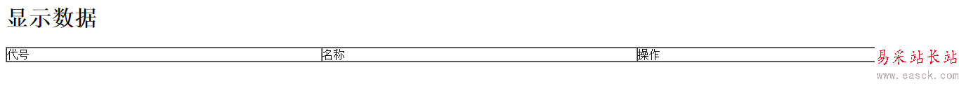 <!DOCTYPE html PUBLIC "-//W3C//DTD XHTML 1.0 Transitional//EN" "http://www.w3.org/TR/xhtml1/DTD/xhtml1-transitional.dtd"><html xmlns="http://www.w3.org/1999/xhtml"><head> <meta http-equiv="Content-Type" content="text/html; charset=utf-8" /> <title>無標題文檔</title> <script src="jquery-1.11.2.min.js"></script></head><body><h1>顯示數據</h1><table width="100%" border="1" cellpadding="0" cellspacing="0"> <tr> <td>代號</td> <td>名稱</td> <td>操作</td> </tr> <tbody id="td"> </tbody></table></body></html><script> $.ajax({ url:"jiazai.php",// 顯示所有的數據不用寫data dataType:"TEXT", success:function(data) { } });</script>圖: