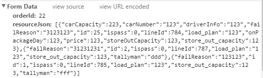 { "orderId": 22, "resourceJson": [ { "carCapacity": 223, "carNumber": "123", "driverInfo": "123", "failReason": "3123123", "id": 25, "ispass": 0, "lineId": 784, "load_plan": "123", "onPackageDay": 123, "price": 123, "storeOutCapacity": 123, "store_out_capacity": 123 }, { "failReason": "31231231", "id": 2, "ispass": 0, "lineId": 787, "load_plan": "123", "store_out_capacity": 123, "tallyman": "ddd" }, { "failReason": "123123", "id": 1, "ispass": 0, "lineId": 785, "load_plan": "123", "store_out_capacity": 123, "tallyman": "fff" } ]}其中resourceJson字段是一個數組,如果直接把這個JSON數據傳給后臺