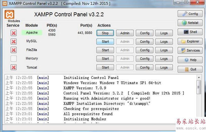 2.現(xiàn)在來配置XAMPP來部署一個本地服務(wù)器,打開只需要啟用Apache服務(wù),下面我就啟動成功了。如果啟用不成功,Port(s)沒有數(shù)據(jù)顯示,就證明你監(jiān)聽的PC端口被占用,你可以在Config的里第一個選項(xiàng)進(jìn)行監(jiān)聽端口的更改,找到記事本里的Listen 8080命令改后綴,這里我把監(jiān)聽端口改成空閑的8080了。