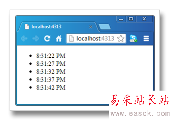 <!DOCTYPE html> <html> <head> <title>@ViewBag.Title</title> <script type="text/javascript" src="@Url.Coutent(“~/Scripts/jquery-...min.js”)"></script> <script type="text/javascript"> $(function () { window.setInterval(function () { $.ajax({ url'@Url.Action("GetCurrentTime")', success function (result) { $("ul").append("<li>" + result + "</li>"); } }); }, ); }); </script> </head> <body> <ul></ul> </body> </html>采用不同的瀏覽器運行該程序會得到不同的輸出結果,如下圖所示,Chrome瀏覽器中能夠顯示出實時時間,但是在IE中顯示的時間都是相同的。