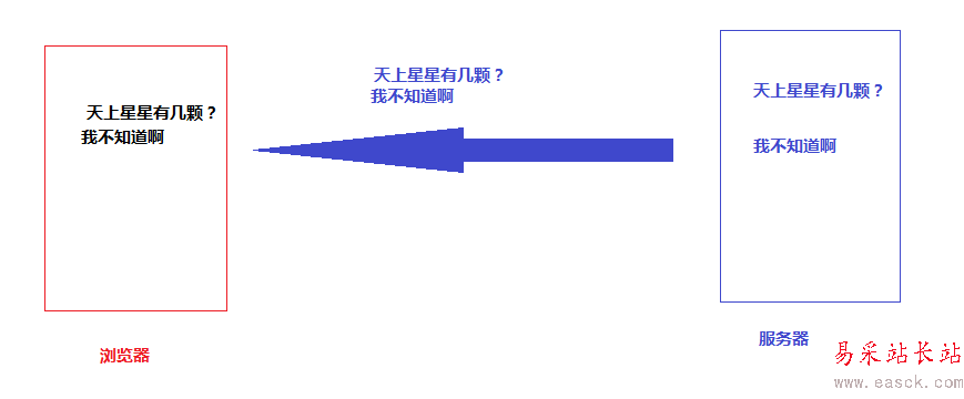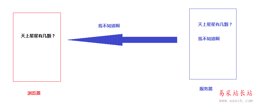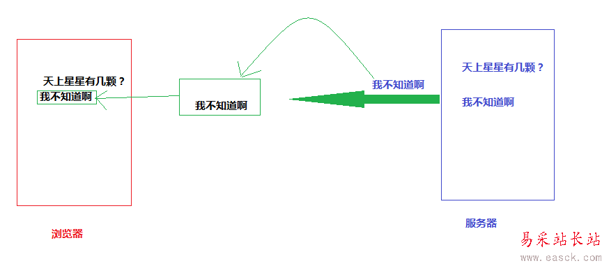 上面介紹了瀏覽器和服務器交互的簡單示意圖,可以看到在最后一步,瀏覽器接收到信息后將本頁面的內容全部進行了更新,但是一般情況下我們只需要將部分內容進行更新,那怎么辦呢?于是服務器干脆將這個頁面的內容修改后全部發送給瀏覽器,于是第2步,服務器向瀏覽器發送的便是"天上星星有幾顆?我不知道啊"這么多的內容,瀏覽器重新更新當前頁面后的結果和發送前的結果一比較,只多了"我不知道啊"這些內容