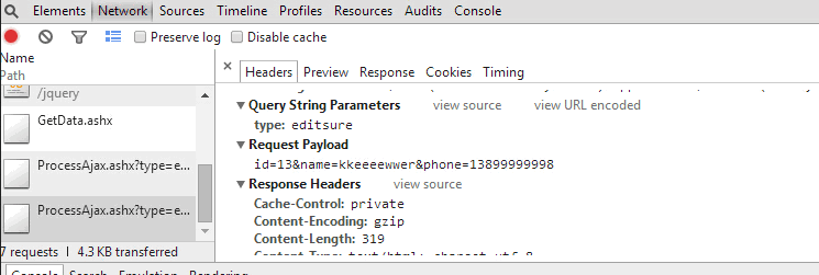 XMLHttpRequest.setRequestHeader("Content-Type", "application/x-www-form-urlencoded");否則的話后臺是不能接收到傳過去的值的。因為在谷歌瀏覽器的編譯器中顯示,傳值在Request Payload中,這是錯誤的(如圖) --屬性注意看