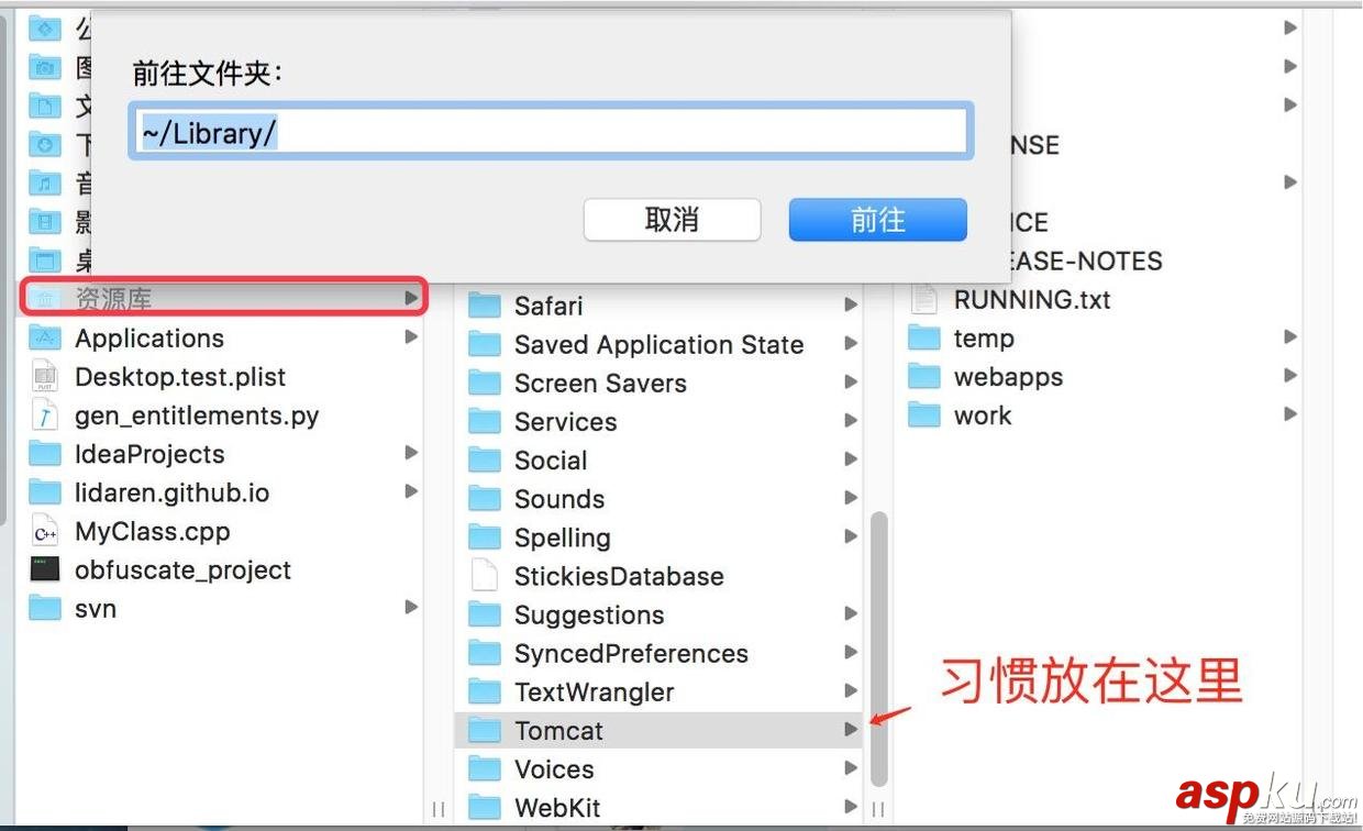 右鍵Finder—>前往文件夾—> ~/Library/ 目錄下,把下載下來包解壓,之后然后命名為Tomcat,放進來這里。
