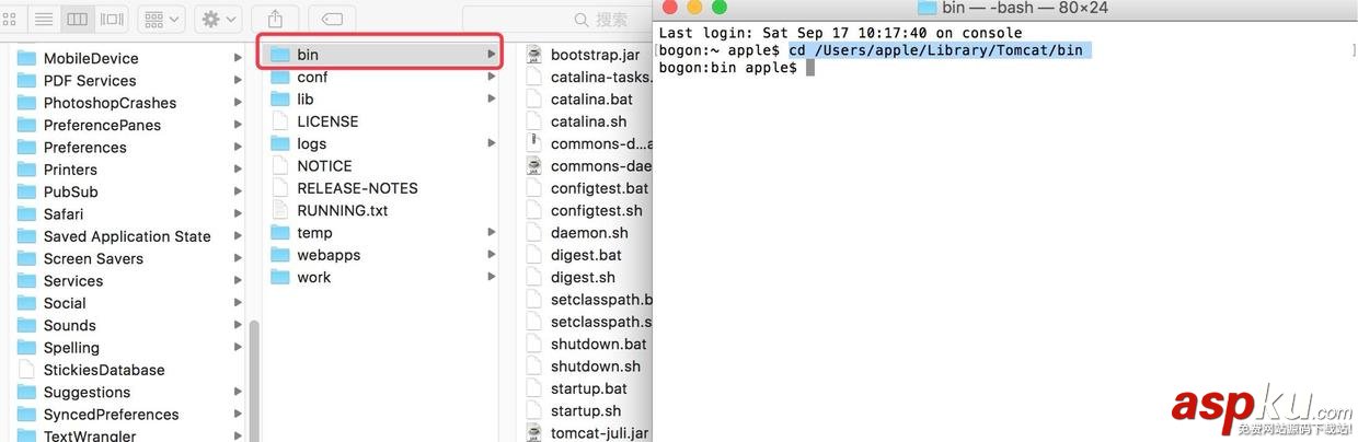 打開終端,cd /Users/apple/Library/Tomcat/bin (注釋:切換到我們Tomcat的bin目錄)