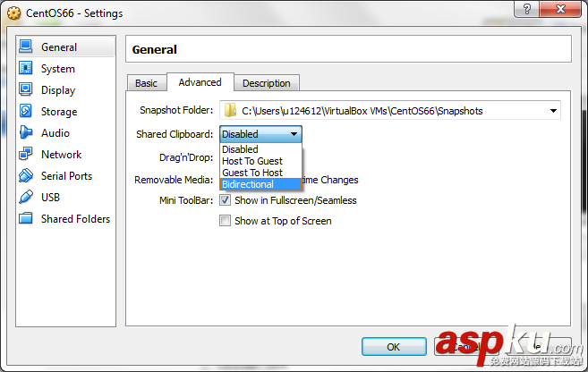 在VirtualBox中選定虛擬鏡像后,點(diǎn)擊”Settings“按鈕,在Generla->Advanced下,Shared Clipboard默認(rèn)為Disabled,將其修改為Bidirectional就可以了。