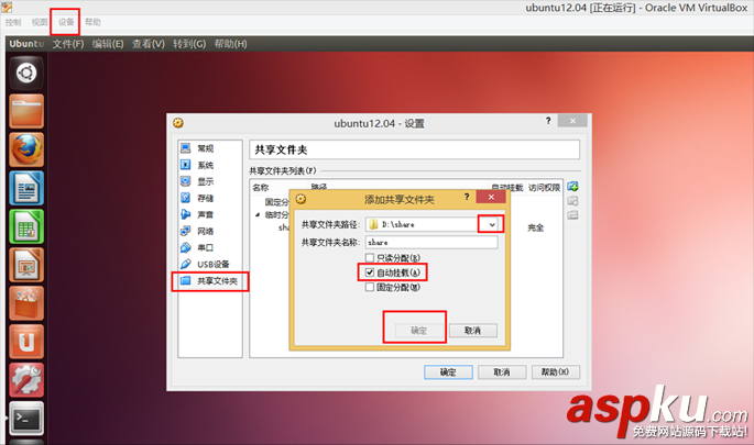 2、先關閉ubuntu,在virtualbox“設置”中找到“共享文件夾”,點擊進入,點擊右邊添加目錄按鈕,添加windows中要共享的目錄,取一個名。比如我在D盤建一個名為share的文件夾,如下圖: