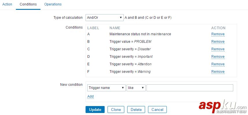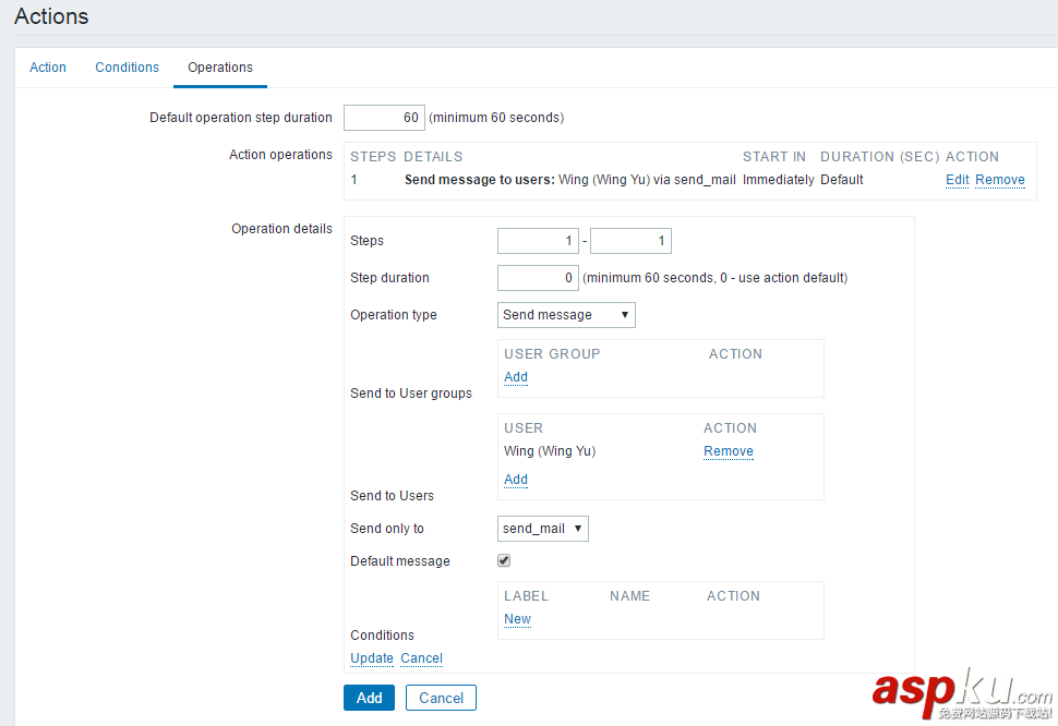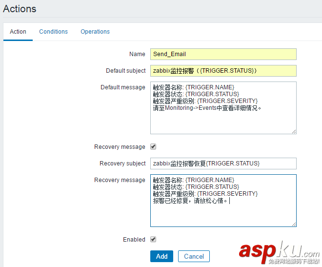 創建action實現郵件報警Configuration –> Actions –> Create action