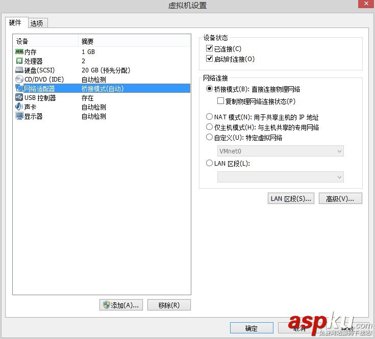 在虛擬機系統上右鍵,進入【設置】界面,在【硬件】選項卡中,找到【網絡適配器】(沒有就自行添加硬件),設置為橋接模式,如下圖。其中“復制物理網絡連接狀態”不知道要不要選中,至少不選中是可以連接的。