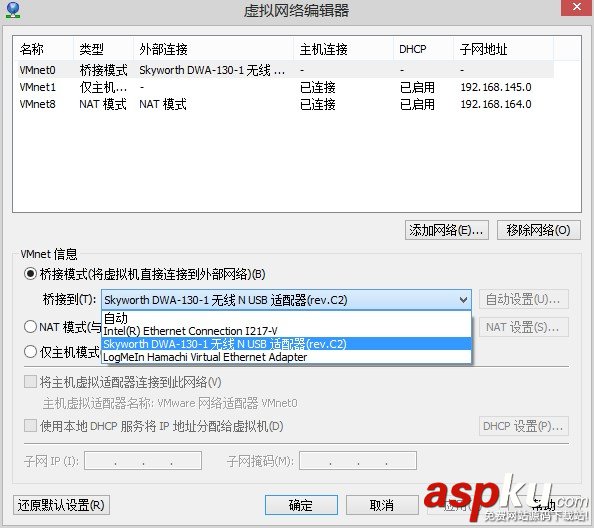 在 VMware 中打開【編輯】->【虛擬網絡編輯器】,添加 VMnet0,并選擇橋接模式。需要注意的是,需要選擇“橋接到”的網卡,使用無線網卡就選無線網卡,使用有線網卡就選有線網卡,如下圖: