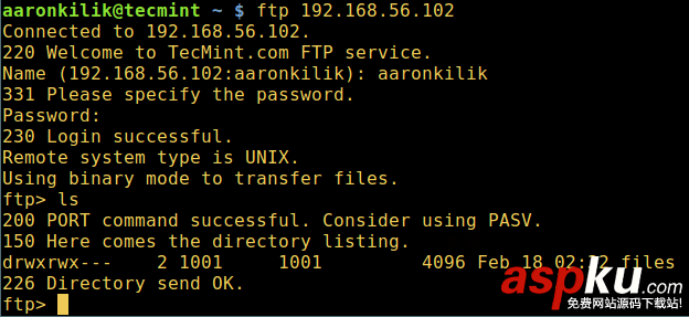 # ftp 192.168.56.102Connected to 192.168.56.102 (192.168.56.102).220 Welcome to TecMint.com FTP service.Name (192.168.56.10:aaronkilik) : aaronkilik331 Please specify the password.Password:230 Login successful.Remote system type is UNIX.Using binary mode to transfer files.ftp> ls