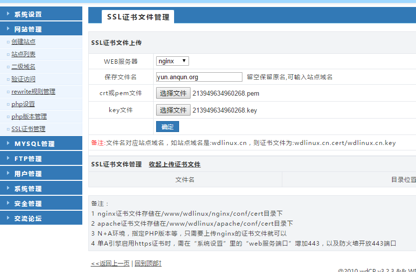 4. 在“網站管理” --> “SSL證書管理” 里上傳證書。本例是選擇 nginx 為 WEB服務器,保存文件名是yun.anqun.org,上傳在阿里云“云盾”安全證書下載的.pem和.key文件